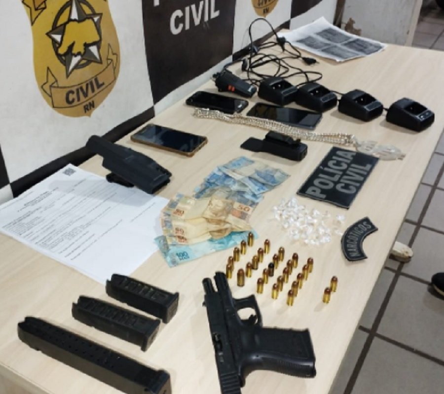 As diligências realizadas no bairro da Cidade Alta, zona leste da capital potiguar, resultaram na prisão de José Jonatas Danyas da Silva, 24 anos, que possuía mandado de prisão definitiva pela prática de roubo. Na oportunidade, foi apreendido em poder do capturado uma pistola Glock G25, 27 munições .380, três carregadores, sendo um alongado com capacidade para 30 munições, quatro celulares, 48 pedras de crack e R$ 260 em dinheiro fracionado.