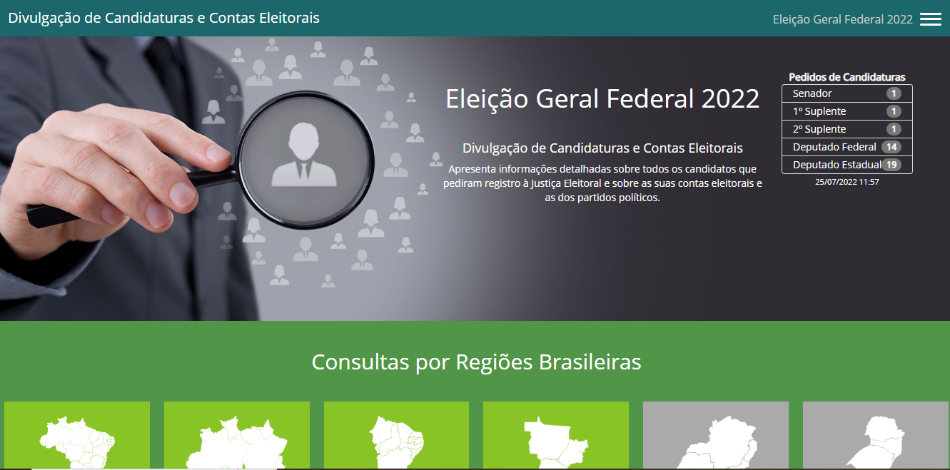 Na página principal do sistema, o interessado encontrará a quantidade total de candidaturas e as candidatas e candidatos por cargo. No mapa do Brasil, é possível filtrar a pesquisa clicando na unidade da Federação e depois no cargo desejado. Em seguida, aparecerá uma lista com todas as pessoas que concorrem ao cargo no estado.