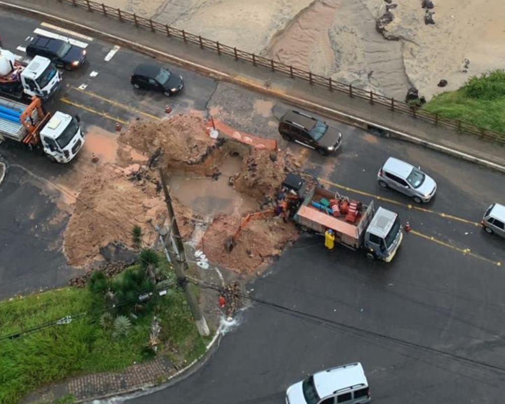 Foram danificadas três redes da companhia, sendo a rede de esgoto, a rede de água e o recalque da Estação Elevatória de Esgoto Relógio do Sol.