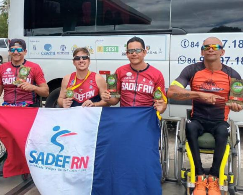 A cidade de Assu sediou neste último final de semana o 3° Rachão Solidário Bike Interação. O evento foi criado com o objetivo de promover a socialização entre grupo de ciclistas, e foi tão bem aceito que voltou esse ano com novidades. Entre elas, categorias competitivas e com premiações em dinheiro. Na categoria handbike, voltada para atletas com deficiência, a Sadef (Sociedade Amigos do Deficiente Físico do RN) brilhou, ocupando dois lugares do pódio. Jackson Alexandre, um dos pioneiros da modalidade no Estado, foi o segundo a completar os 16km de prova, seguido de John Lobo logo atrás. Paulo Eduardo foi o campeão.