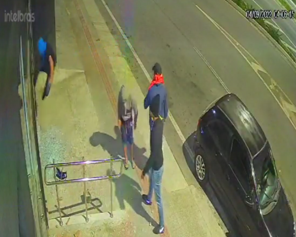 Os quatro suspeitos encapuzados desceram de dois veículos, um de cor preta e outro de cor azul, e começam a jogar pedras na vitrine da loja de motos. Um dos criminosos chega a chutar a porta de metal, e enquanto isso, o motorista aguarda no carro, dando cobertura ao grupo.