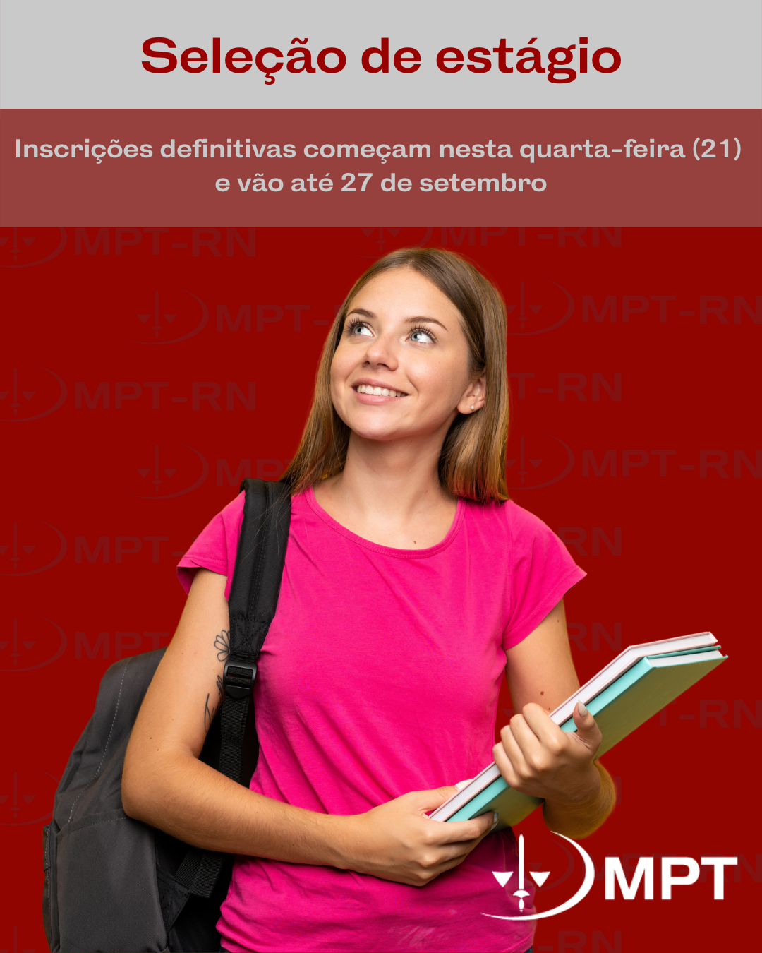 Os estudantes de Administração, Direito e Tecnologia da Informação que realizaram inscrições preliminares na seleção de estágio do Ministério Público do Trabalho no Rio Grande do Norte (MPT-RN) precisam apresentar, até as 16 horas do dia 27 de setembro, os documentos necessários para confirmar a participação no certame, conforme previsto no edital.