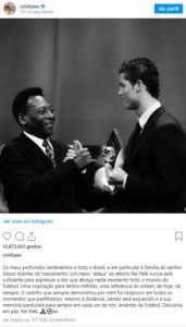 O português Cristiano Ronaldo também se pronunciou sobre a perda de Pelé. Em mensagem em suas redes sociais ele demonstrou o seu carinho pelo povo brasileiro neste momento: “Meus profundos sentimentos a todo o Brasil, e em particular à família do senhor Edson Arantes do Nascimento. Um mero adeus ao eterno Rei Pelé nunca será suficiente para expressar a dor que abraça neste momento todo o mundo do futebol. Uma inspiração para tantos milhões, uma referência de ontem, hoje e sempre. O carinho que sempre demonstrou por mim foi recíproco em todos os momentos que partilhamos, mesmo à distância. Jamais será esquecido e a sua memória perdurará para sempre em cada um de nós, amantes de futebol. Descansa em paz, Rei Pelé”.