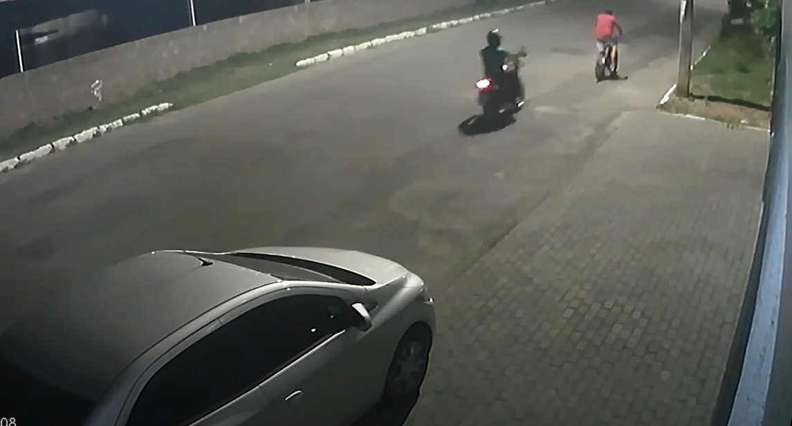Como podemos ver nas imagens, a vítima, que está de camisa vermelha, pedalava em uma bicicleta quando um homem em uma moto se aproximou dele e atirou pelas costas.