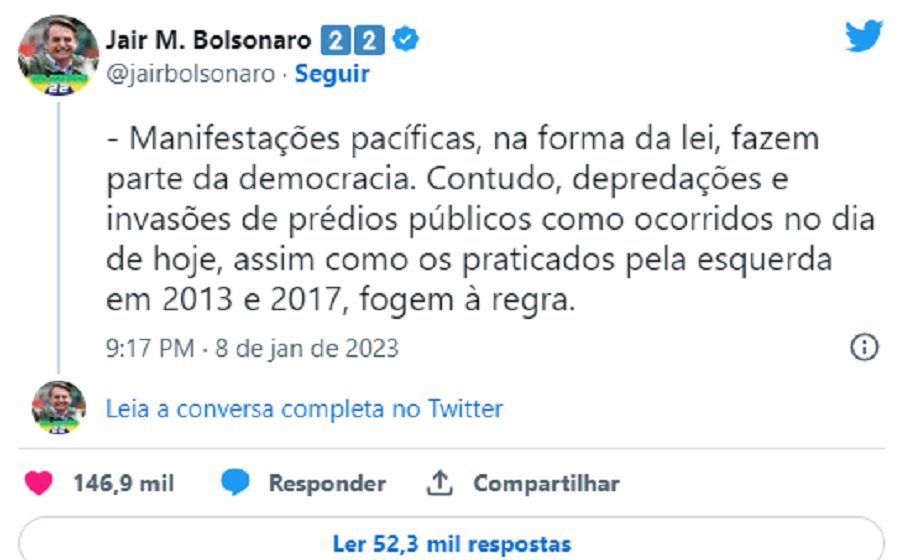 “Manifestações pacíficas, na forma da lei, fazem parte da democracia. Contudo, depredações e invasões de prédios públicos como ocorridos no dia de hoje, assim como os praticados pela esquerda em 2013 e 2017, fogem à regra”, escreveu, no Twitter.