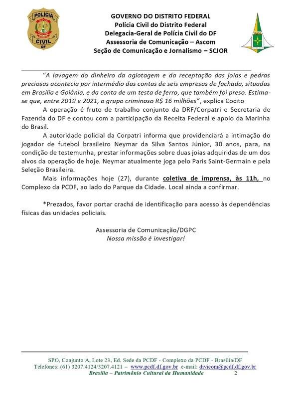 No informe, a Polícia Civil do DF esclareceu que Neymar não é investigado no caso. Investigadores buscam esclarecer se o jogador tinha conhecimento das atividades ilegais das pessoas que adquiriu duas joias. Nesta sexta (27), a Polícia do Distrito Federal concederá uma entrevista coletiva para prestar mais detalhes da investigação.