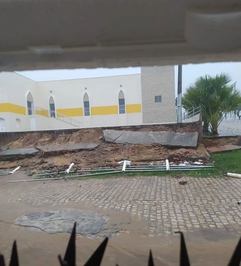 Parte da calçada da Igreja Matriz Beata Lindalva e São Cristóvão em Assú, desabou por causa das fortes chuvas que caíram nesta quinta-feira (30) no município. A informação foi confirmada por moradores da cidade.