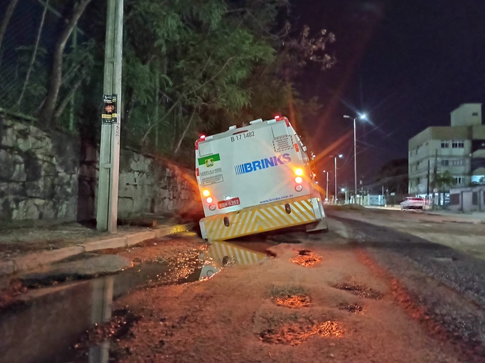 Um carro-forte caiu em buraco na Avenida Jerônimo Câmara, no bairro de Lagoa Nova, Zona Sul de Natal, na noite desta segunda-feira (10). Foram necessárias quase duas horas para fazer a retirada do veículo do local.