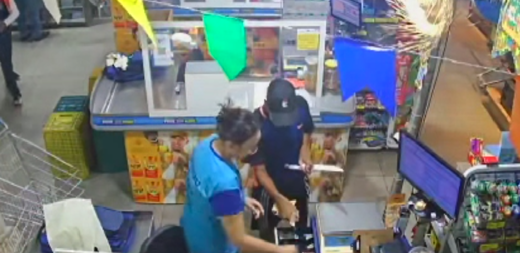 Câmeras de segurança flagraram o momento em que quatro homens entram no supermercado. Era por volta de 17h40, quando os criminosos entram armados com facas. Eles usavam máscaras para não serem identificados.