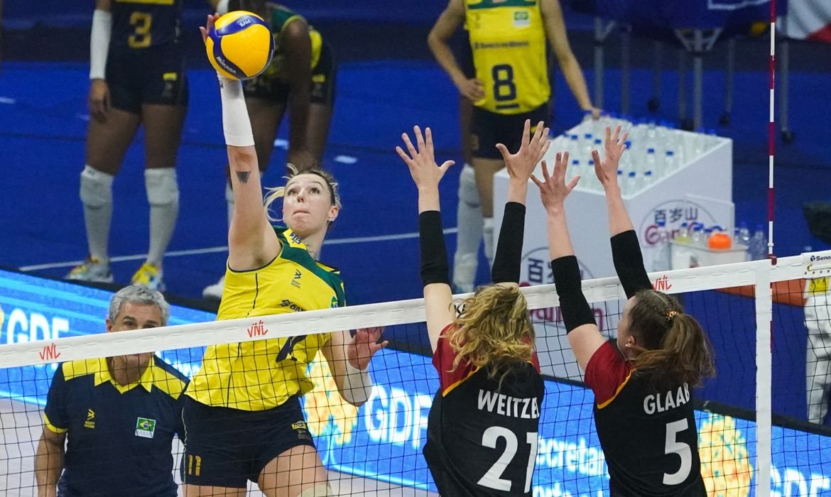 A seleção feminina brasileira de vôlei emplacou a sexta vitória seguida na Liga das Nações ao superar a Alemanha neste sábado (17), por 3 sets a 1 (25/22, 25/18, 22/25 e 25/17), diante da torcida que lotou o estádio Nilson Nelson lem Brasília (DF). O último jogo no Brasil em casa, encerrando a segunda semana da Liga, será contra os Estados Unidos, neste domingo (18), às 10h (horário de Brasília). A seleção norte-americana estava invicta até hoje (17), quando perdeu por 3 sets a 2 para o Japão. As brasileiras também sofreram uma derrota na competição. O revés foi na estreia contra a China (3 sets a 2), no último dia 31, em Nagoya (Japão).