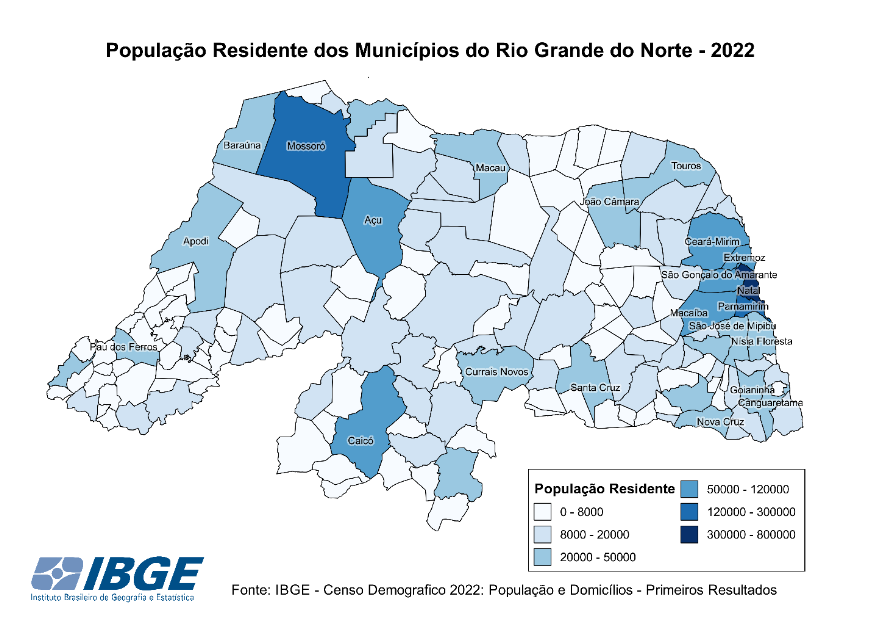 Em 2022 a população residente do RN passou a ser de 3.302.406 pessoas, um aumento de 134.379 pessoas em relação à 2010, representando uma taxa geométrica de crescimento de 0,35%, abaixo da média nacional de 0,52%.