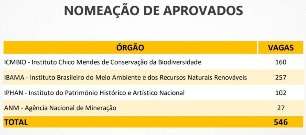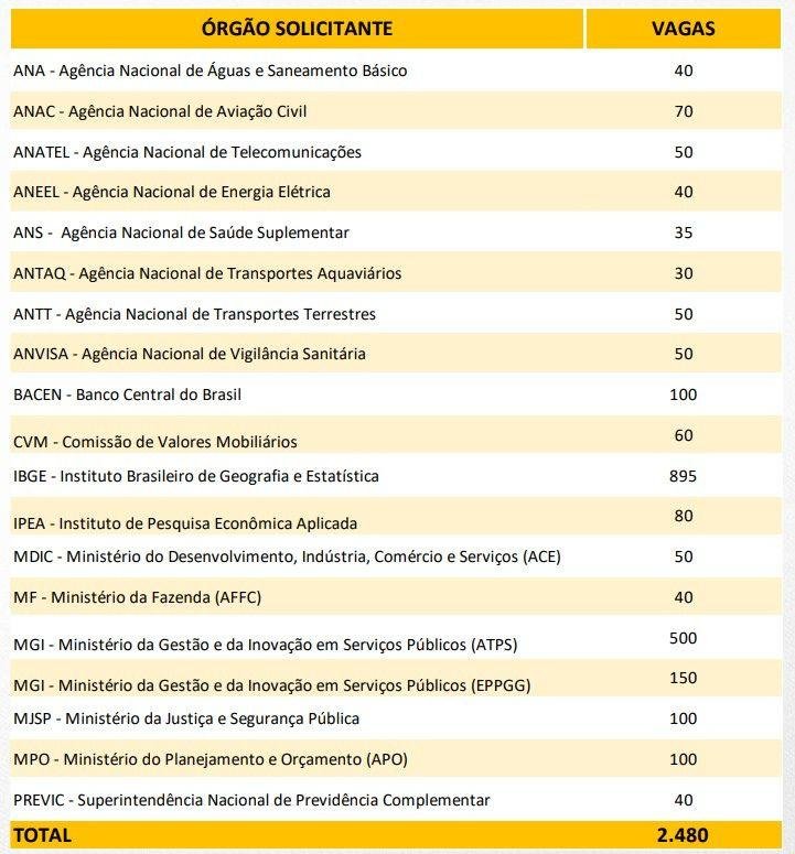 Veja o quadro novos concursos autorizados e a quantidade de vagas para cada órgão: