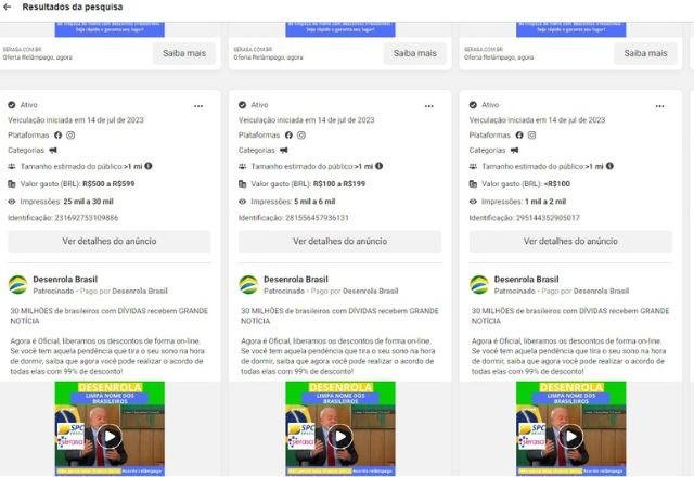 Na segunda-feira (17), dia do lançamento do Desenrola pelo governo de Luiz Inácio Lula da Silva (PT), a página falsa no Facebook fez, pelo menos, 108 anúncios patrocinados que levavam a um site fraudulento, por um valor entre R$ 10 e R$ 15 mil. Mais de 500 mil pessoas foram alcançadas pelas publicações.