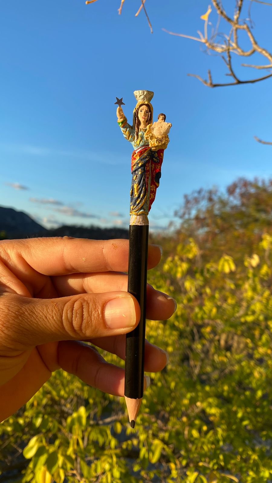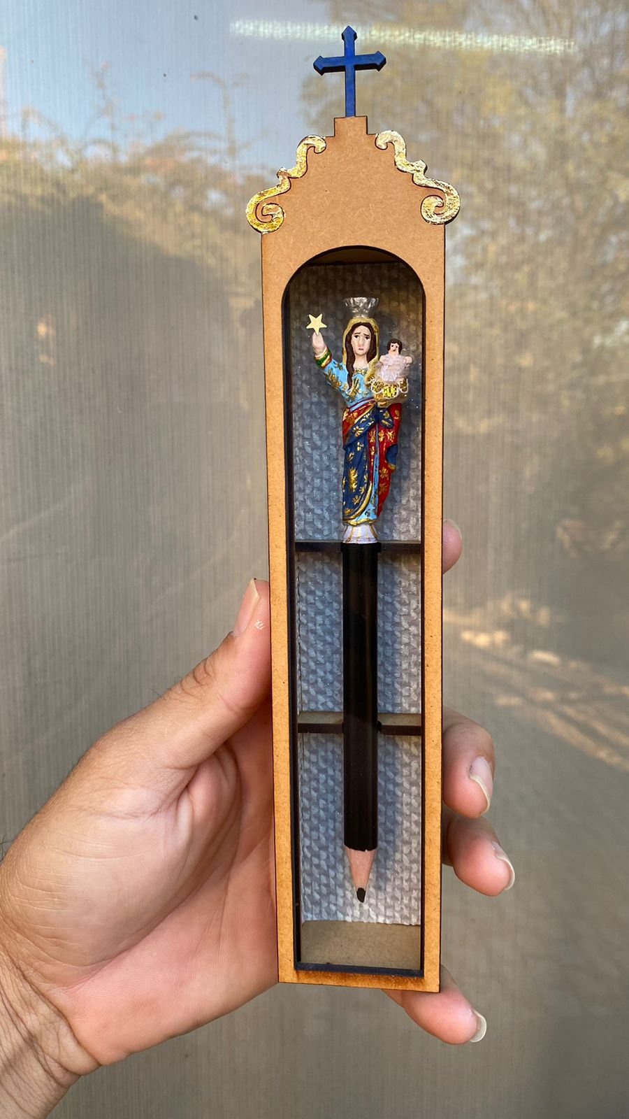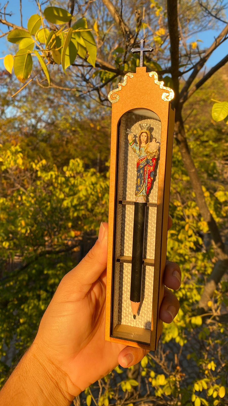 “Um lápis, por exemplo, de Nossa Senhora da Guia, que é a padroeira da Acari, eu posso passar até três dias. Desde o entalhe até a pintura do próprio lápis e da caixinha que é em formato de oratório.”, completa.