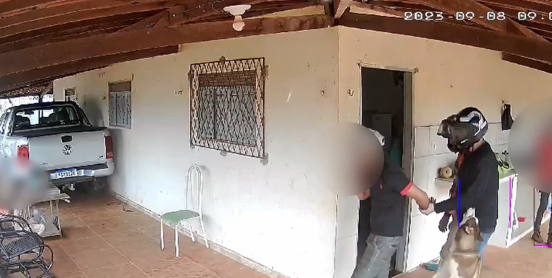 Nas imagens exibidas no Patrulha da Cidade desta sexta-feira (08), é possível ver o momento em que a dupla chega. Os moradores estavam na varanda, entre eles, uma criança. Os criminosos armados abordam um dos homens e em seguida o dono da residência, rendendo ele e levando até o carro.