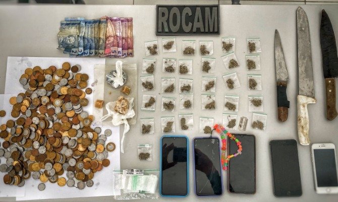 Durante a abordagem foi encontrado com eles um vasto material ilícito, tais como maconha, crack, diversas embalagens plásticas para acondicionamento de entorpecentes, dinheiro fracionado, facas e aparelhos celulares.