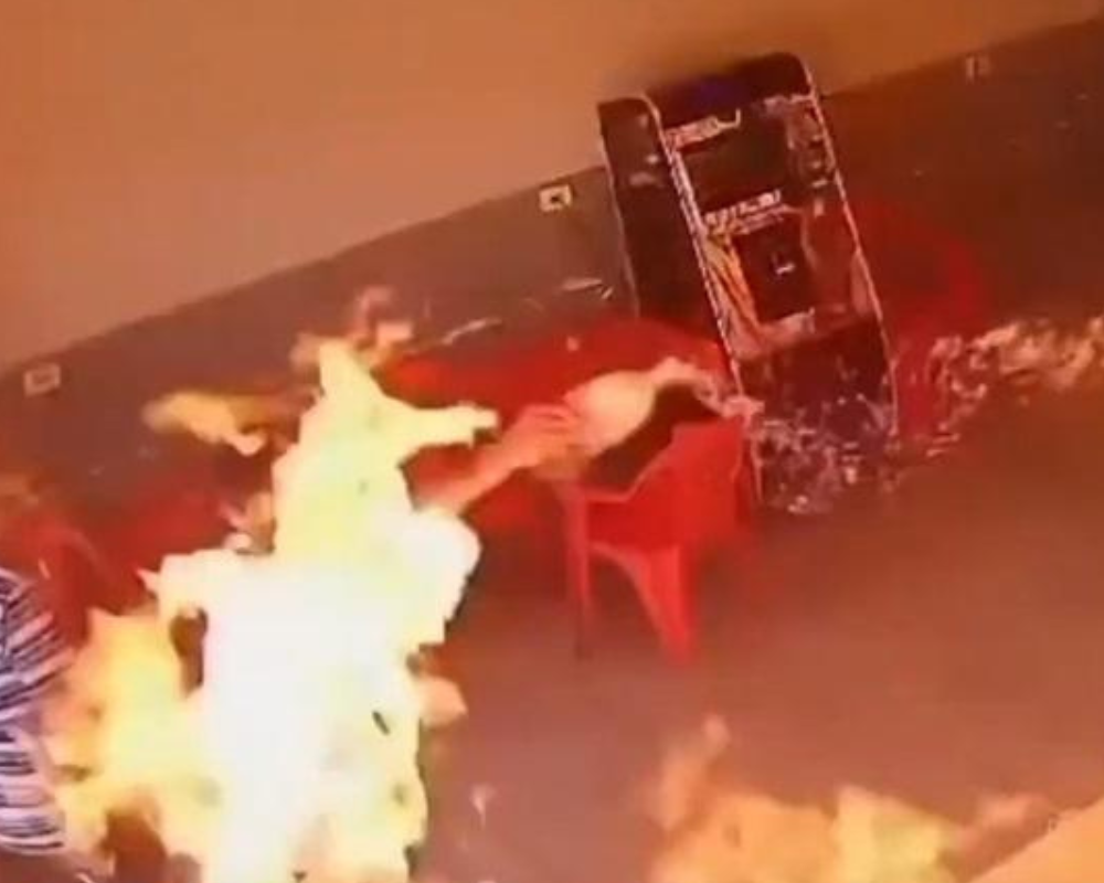 Um comerciante se negou a vender cachaça fiado e dois homens decidiram colocaram fogo no bar, em Punhalão, cidade no norte do Paraná. Uma câmera de monitoramento registrou a cena, ocorrida no sábado (12).