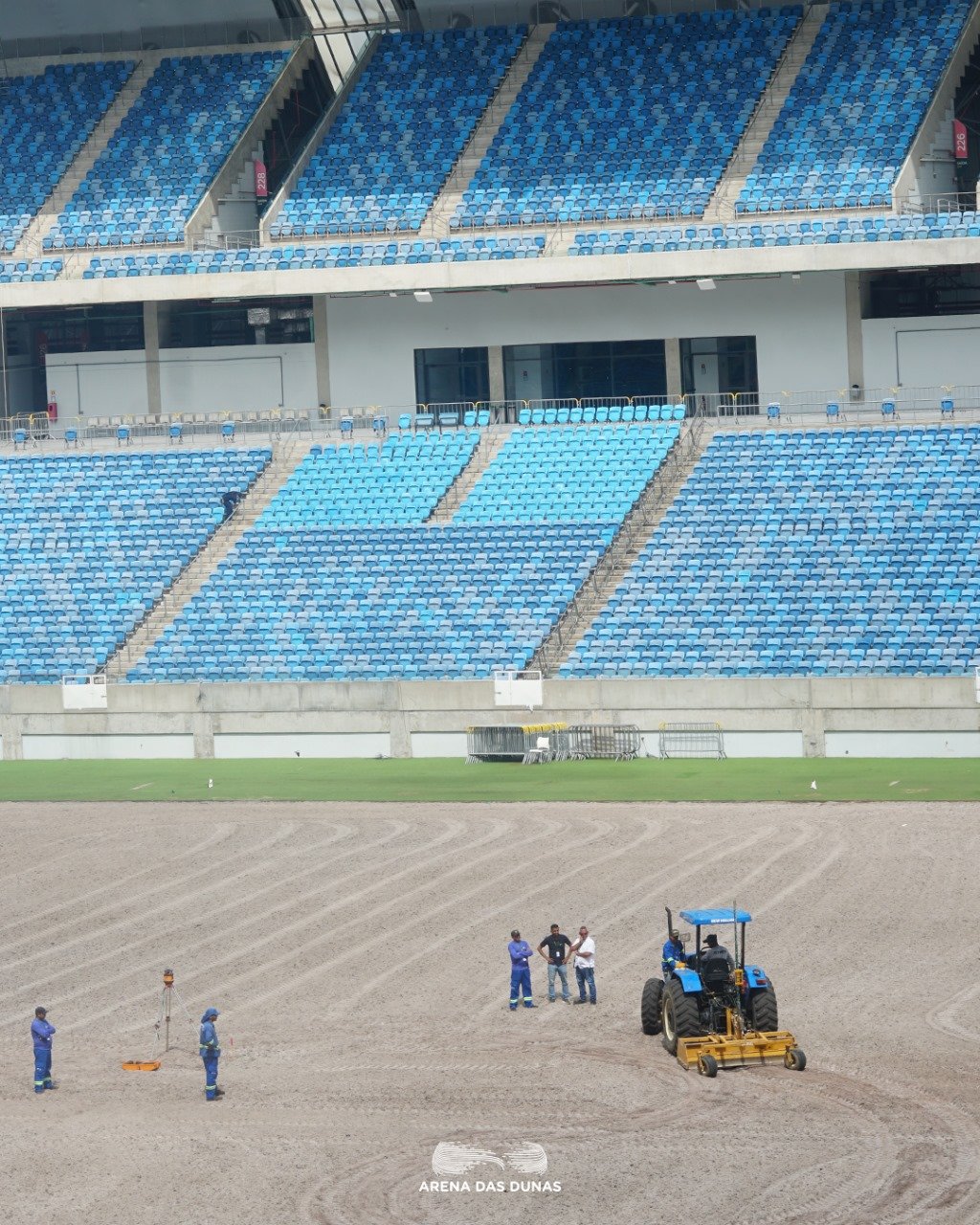 Prezando sempre pelos mais altos padrões de excelência, a Arena das Dunas, depois de quase 10 anos de uso, dá início à substituição de seu gramado. Homens e máquinas já começaram o trabalho de remoção total do atual gramado e de descompactação, drenagem e nivelamento do solo, para iniciar, logo em seguida – a partir da próxima semana -, a implantação de 9.000m2 da nova grama para a temporada de 2024.