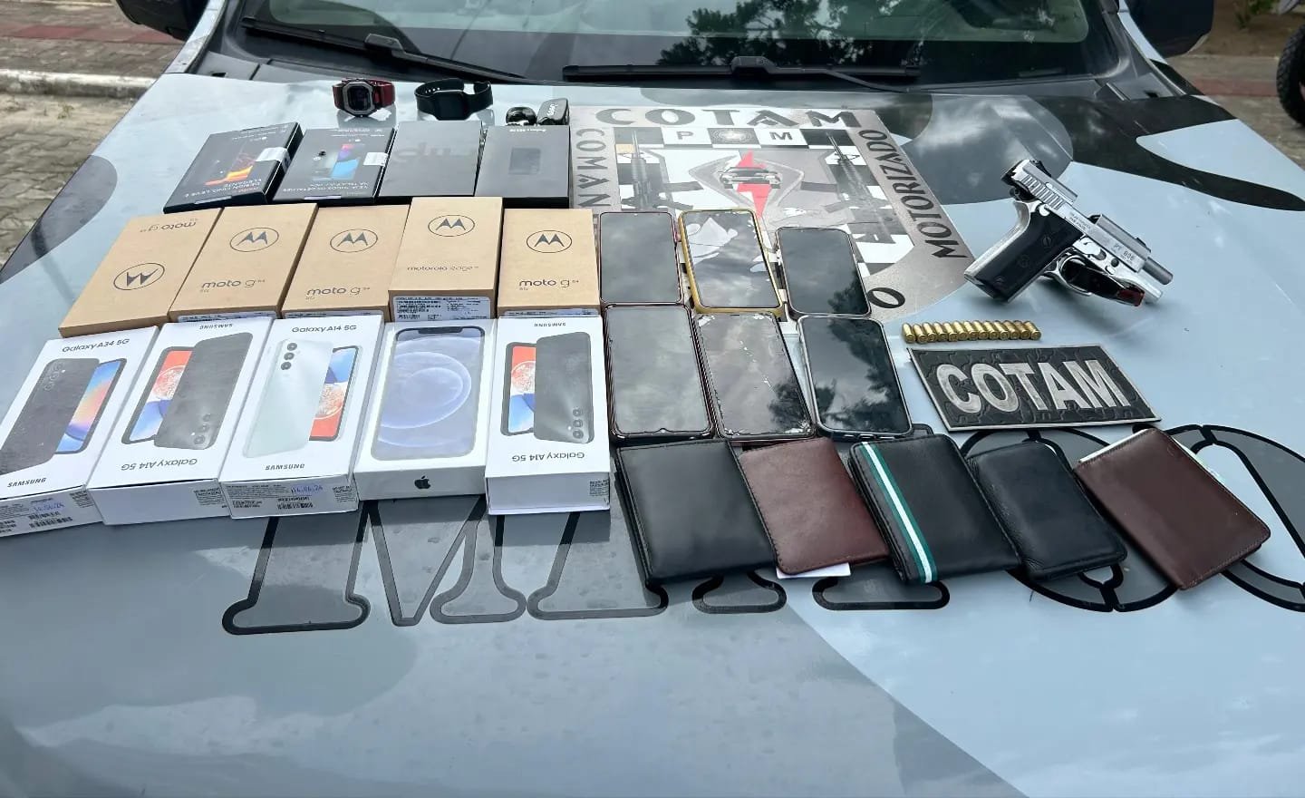 Ainda segundo a DEFUR/Caicó, além dos flagrantes, todos os suspeitos possuem mandados de prisão oriundos de investigações da Polícia Civil do Estado do Sergipe, em razão de um roubo ocorrido em Aracaju/SE, no dia 17/01. Quartoze celulares foram recuperados e uma arma de fogo, utilizada no assalto de hoje (26), foi apreendida.