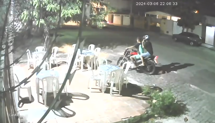 Nas imagens, é possível ver os suspeitos em fuga, já fora da lanchonete, com uma moto que estava parada no local.