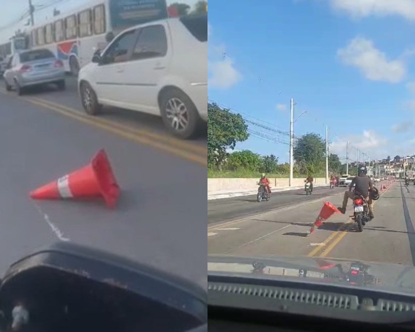 Na tarde da segunda-feira (18), o vídeo de um motociclista derrubando propositalmente cones da avenida circulou nas redes sociais. O condutor foi flagrado no momento em que chutava o objeto.