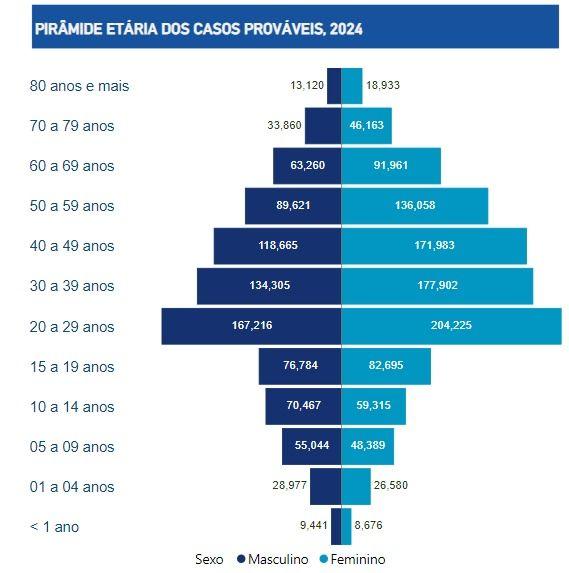 Atualmente, o coeficiente de incidência da doença é de 954,2 casos por 100 mil habitantes. O estado de Minas Gerais continua liderando o número de casos prováveis, com cerca de 645.898 mil registros. Em seguida, aparecem São Paulo (371.353), Paraná (183.698), Distrito Federal (158.629) e Rio de Janeiro (144.418).