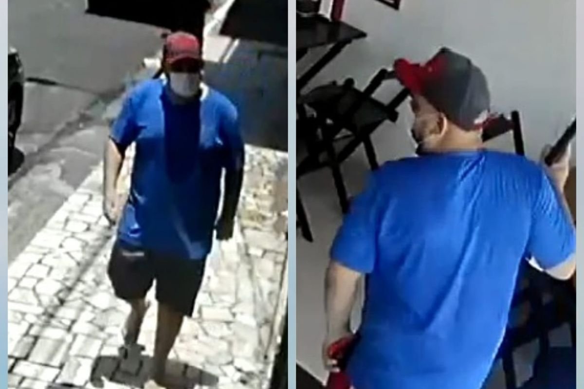Na ocasião, o indivíduo com sobrepeso, vestindo bermuda preta com detalhes vermelhos, camiseta azul e boné preto com vermelho, portando uma arma de fogo, rende um cliente que estava no salão de uma lanchonete e subtrai seus objetos pessoais e a chave do veículo.