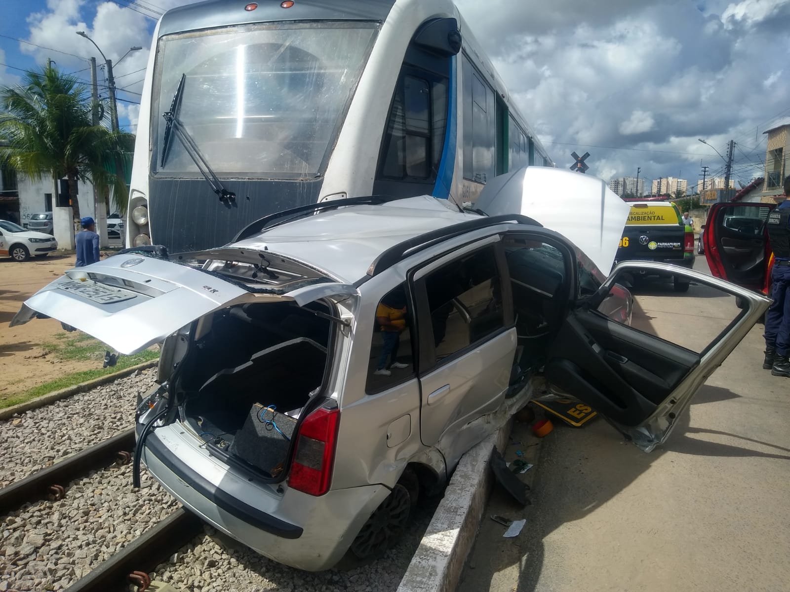 Vídeo: mulher fica presa em carro após colisão com VLT em Parnamirim