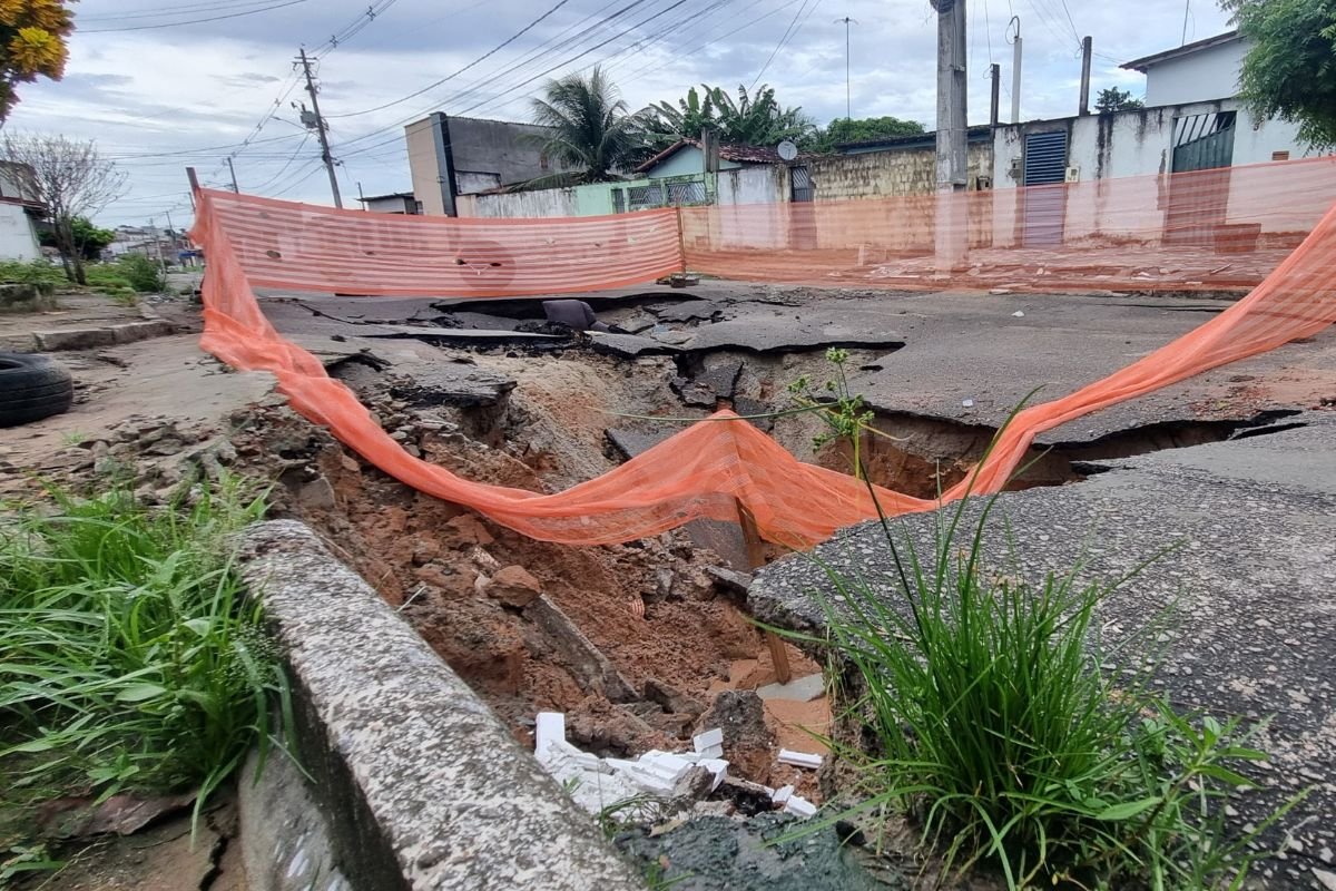 Ainda conforme relatos dos moradores, um caminhão de lixo chegou a cair na cratera. Um poste, próximo ao buraco, ameaça cair.