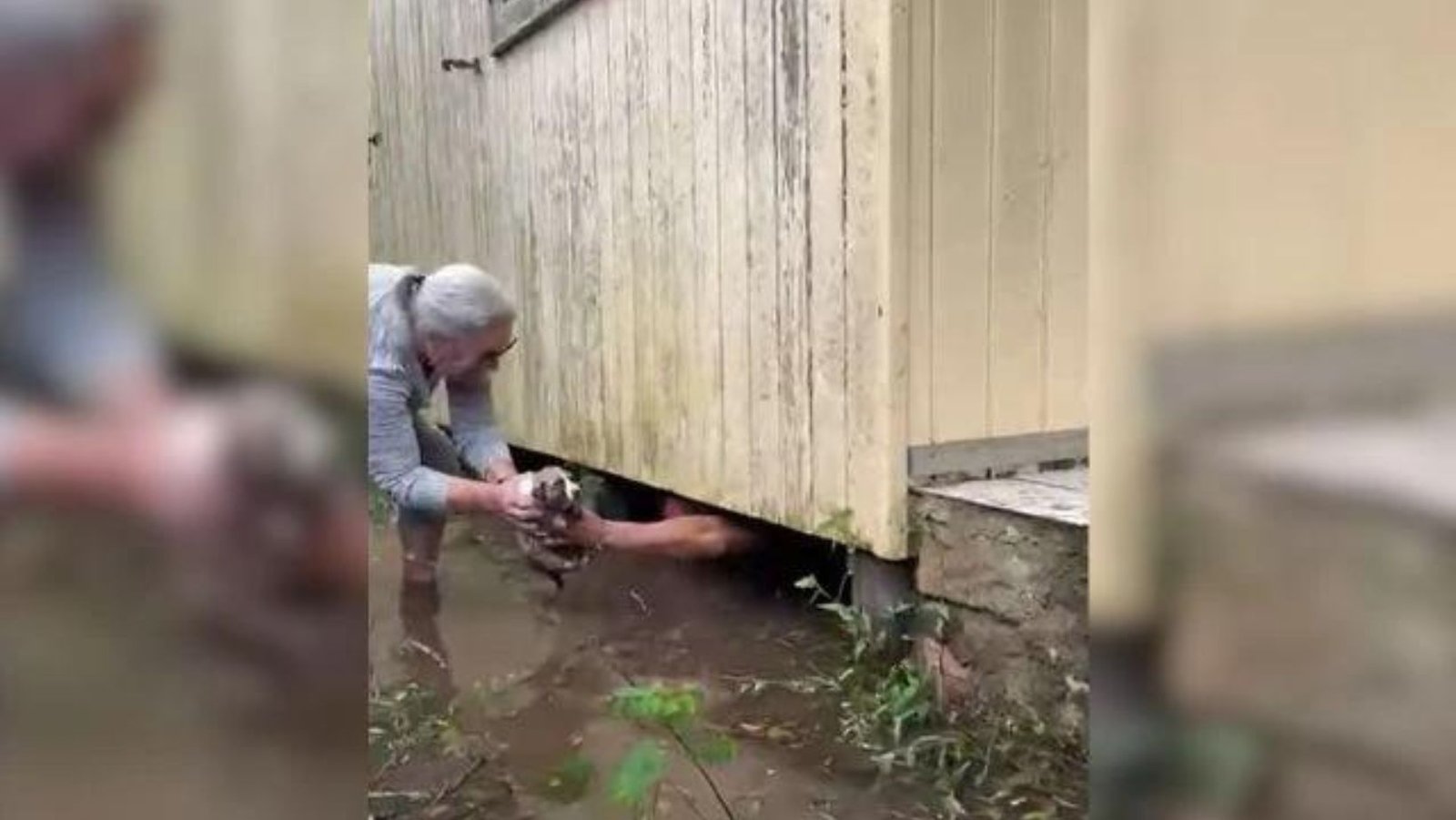 O guarda-vidas Rodrigo Bonora, da Defesa Civil do município, mergulhou por debaixo do imóvel e, em cerca de três minutos, salvou os animais.