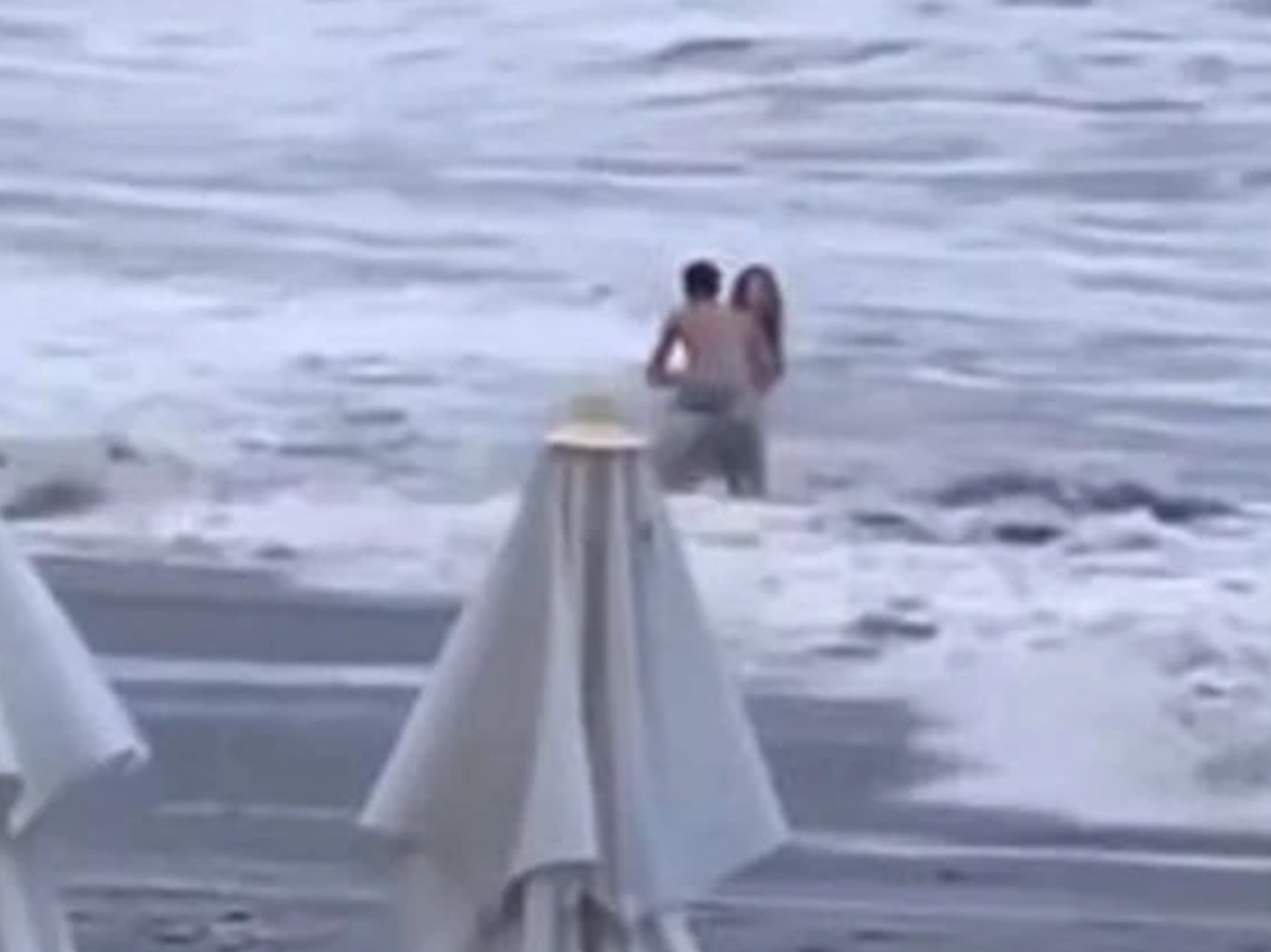 The couple could be seen going to the water’s edge when massive waves… pic.twitter.com/zEaFXoDjkg