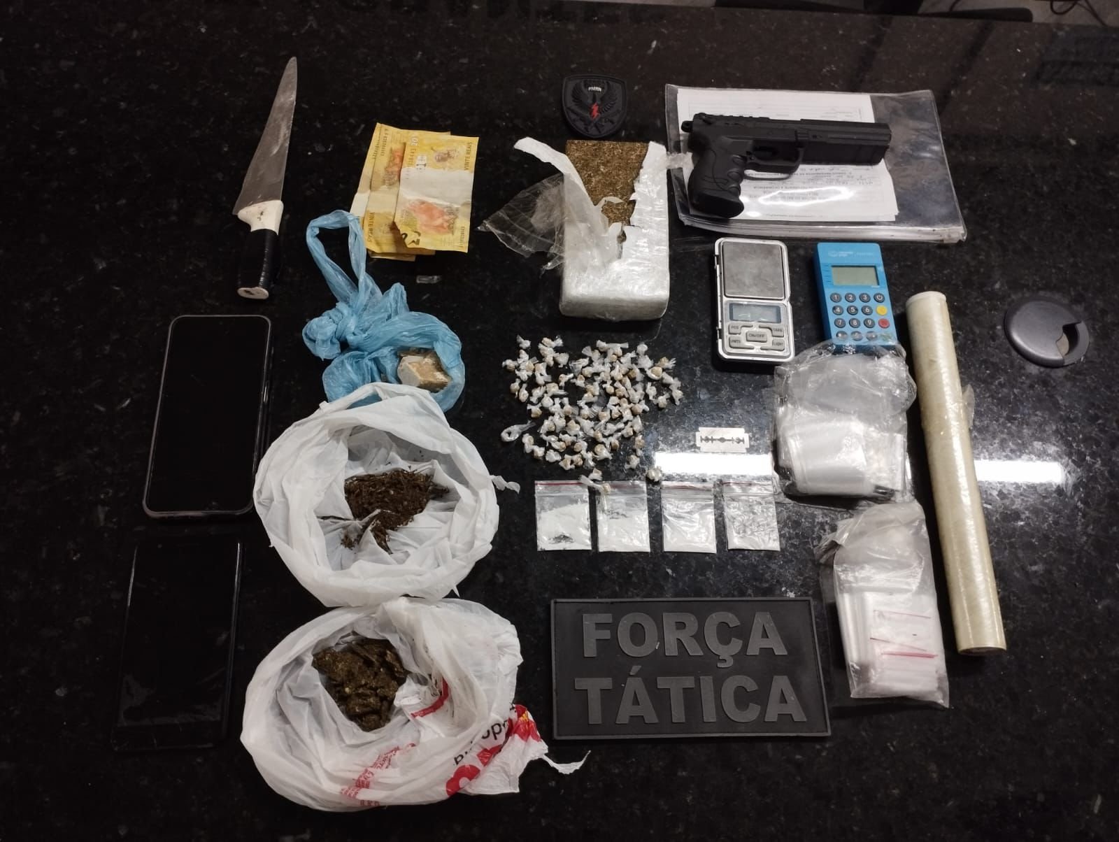 Durante a operação, os agentes encontraram cocaína, crack e um tablete de maconha, além de uma balança de precisão, sacos plásticos e um simulacro de arma de fogo. Os materiais apreendidos reforçam a suspeita de que as casas funcionavam como pontos de tráfico na região.