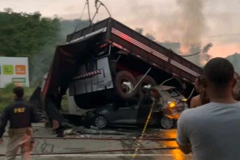 Carreta, carro e ônibus se envolveram em grave acidente em Teófilo Otoni. | Reprodução/Redes Sociais