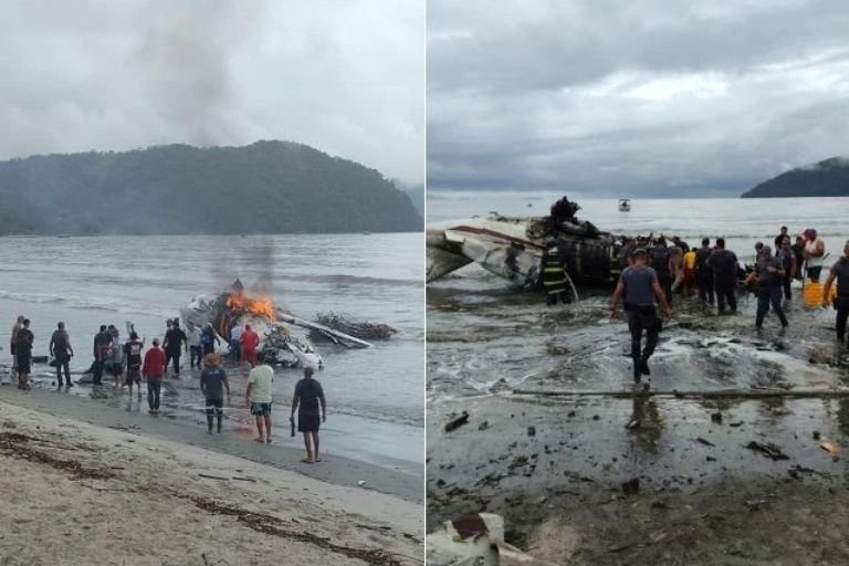 De acordo com a Polícia Militar, a aeronave tentou aterrissar no Aeroporto de Ubatuba, mas passou da pista, caiu na avenida e parou na praia. Câmeras de segurança flagraram o momento em que o avião atinge o solo, explode e cai na água.