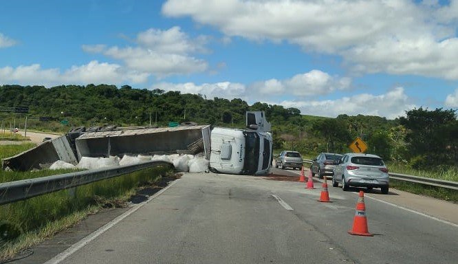 Uma carreta carregada de cimento tombou na madrugada desta sexta-feira (18) no km 129 da BR-101, no trecho da “Subida do Ribeiro”, no município de São José de Mipibu.