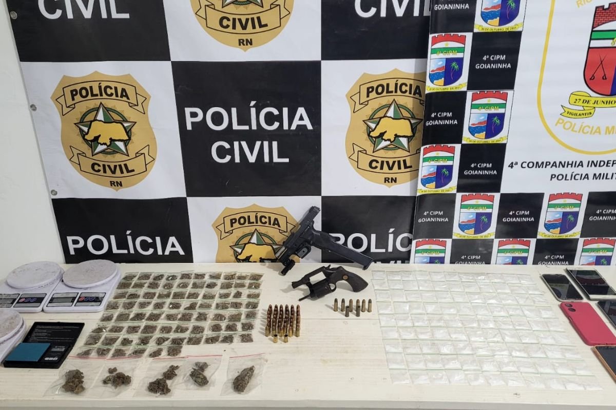 Na residência do suspeito, foram apreendidos: 99 papelotes de cocaína, 76 trouxinhas de maconha, cinco porções de maconha tipo “flor”, quatro balanças de precisão, seis aparelhos celulares, uma pistola G2C calibre 9mm com 41 munições intactas e duas deflagradas, um revólver calibre .38 com seis munições intactas e duas deflagradas. Todo o material apreendido foi encaminhado à delegacia para os procedimentos cabíveis.