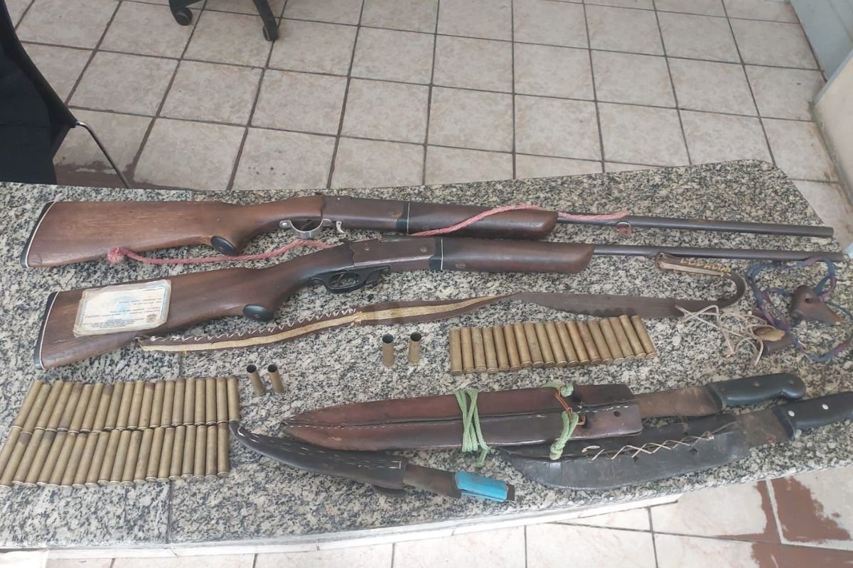 Durante as abordagens, os policiais apreenderam duas armas de fogo — uma de calibre .32 e outra de calibre .36 — além de 58 munições intactas, quatro estojos deflagrados e itens usados na caça. Entre os materiais estavam armadilhas, lanternas, facões e mochilas camufladas, reforçando o caráter organizado da atividade ilegal.