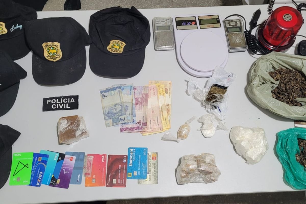 Durante a investigação, as equipes identificaram e localizaram um dos envolvidos no crime. O homem foi detido com porções de cocaína, crack e maconha, além de dinheiro fracionado e materiais usados para o tráfico. Também foram apreendidos uniformes pretos com símbolos da Polícia Civil, levantando suspeitas sobre possível tentativa de disfarce ou intimidação.