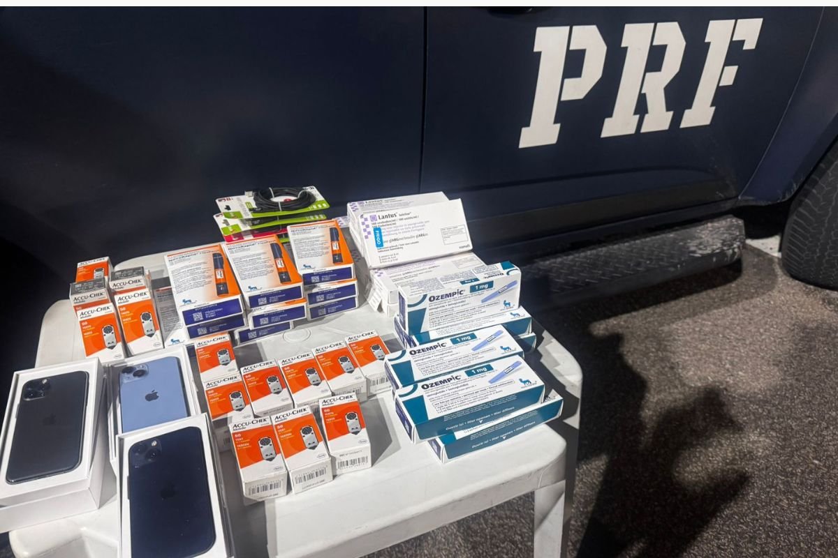 Entre os produtos apreendidos, estavam 32 unidades do medicamento Ozempic, 45 de Novorapid, 45 de Lantus, 16 kits Accu-Chek e três aparelhos iPhone.