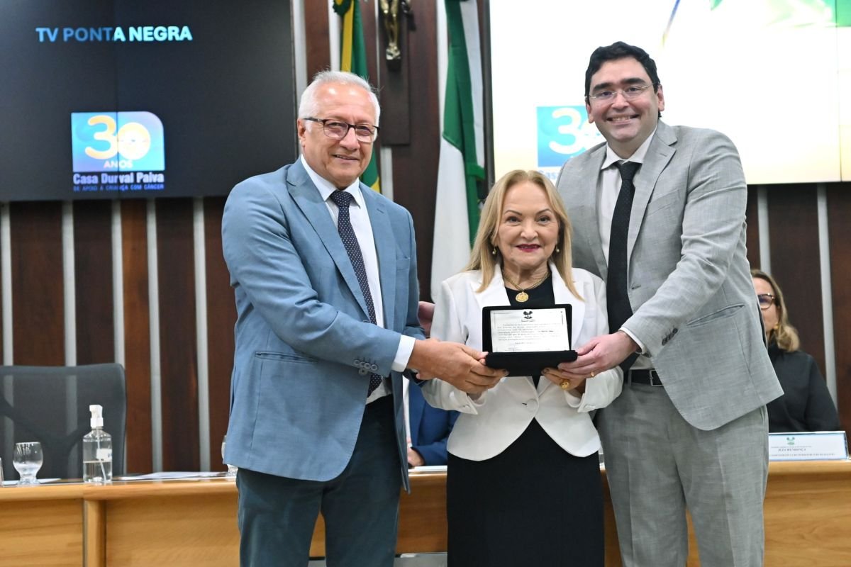 A presidente do Sistema Ponta Negra de Comunicação, Miriam de Sousa, participou da sessão solene realizada na Assembleia Legislativa do RN, nesta quarta-feira (9), em homenagem aos 30 anos da Casa Durval Paiva. A cerimônia reconheceu o trabalho da instituição em prol de crianças e adolescentes em tratamento contra o câncer e doenças hematológicas.