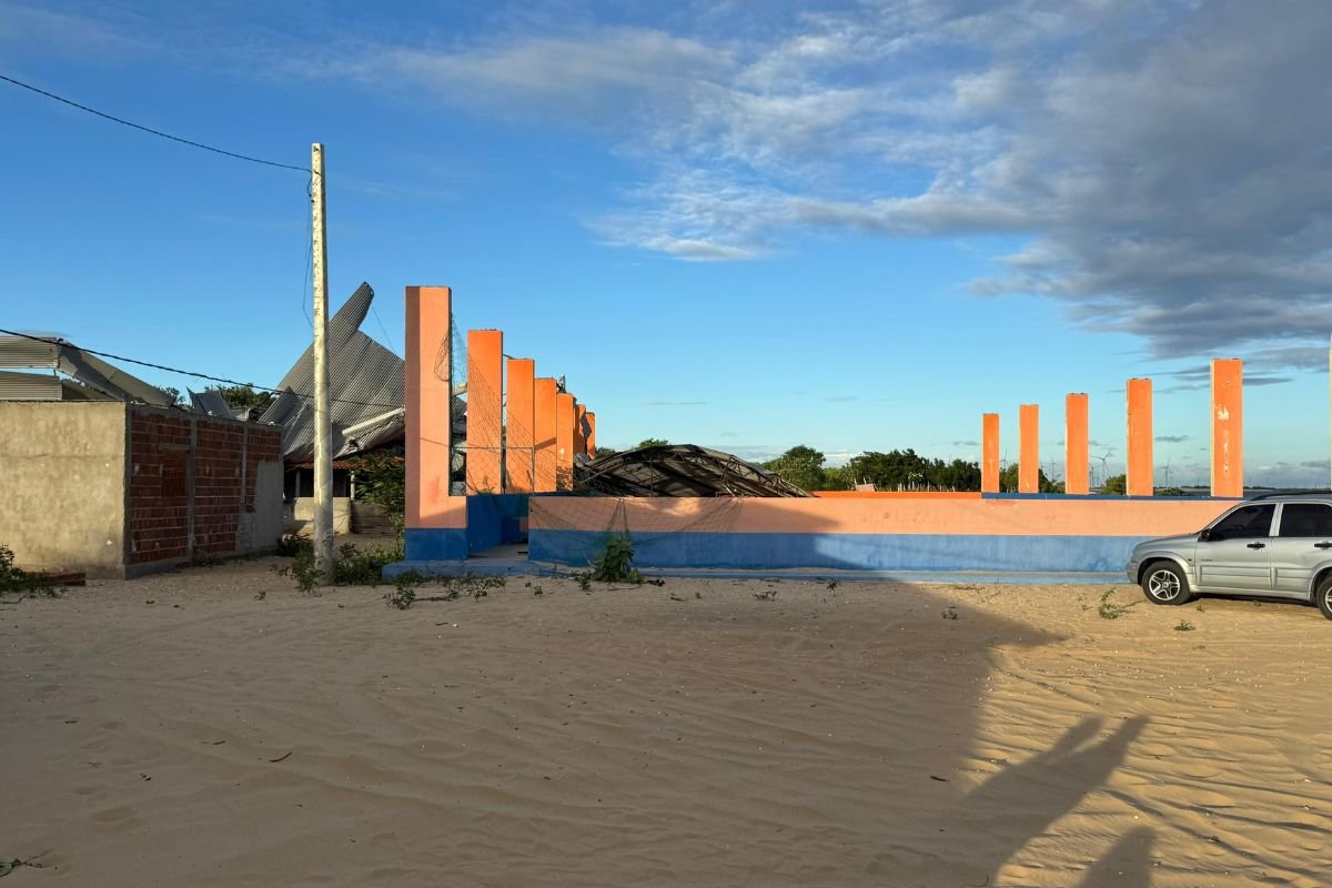 A Prefeitura de Galinhos informou que, na tarde desta quinta-feira (10), fortes rajadas de vento provocaram a queda da cobertura do Ginásio Poliesportivo de Galos. A estrutura foi arremessada contra a rede elétrica e atingiu duas residências vizinhas.