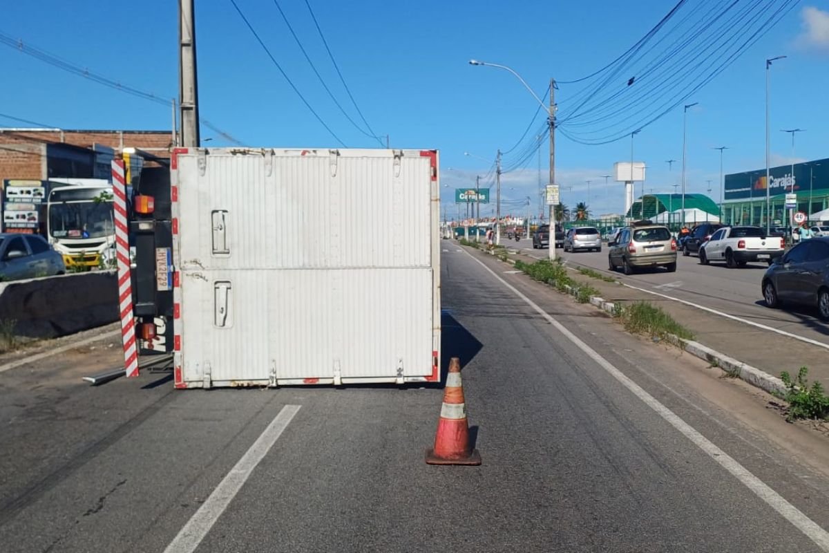Um caminhão tombou na BR-406, no sentido Ceará-Mirim/Natal, em frente ao Carajás, provocando a interdição parcial da rodovia na tarde desta terça-feira (15)