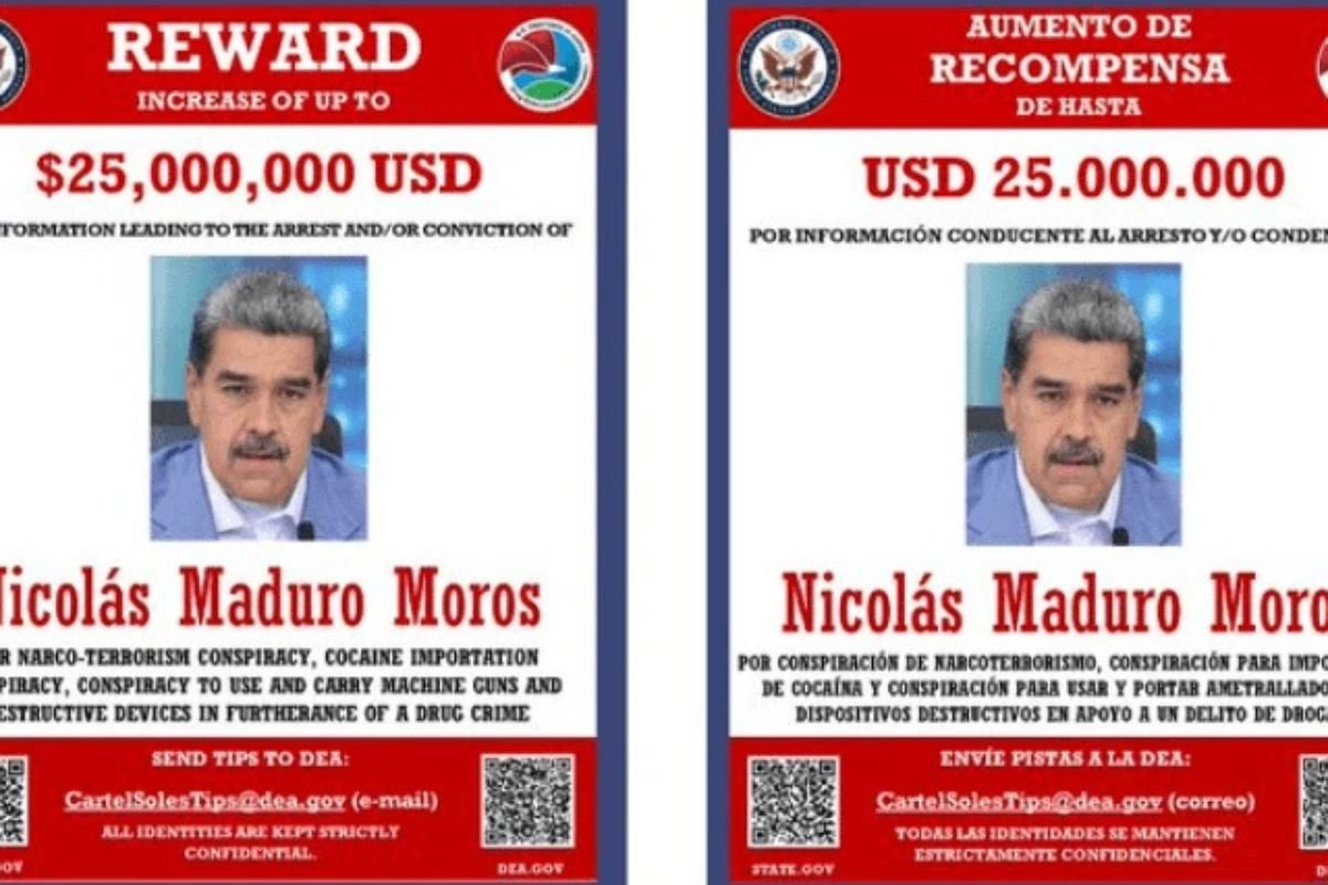A informação foi divulgada em um cartaz oficial da DEA (Administração de Repressão às Drogas), vinculada ao governo americano. A imagem, com foto de Maduro, o acusa de “conspiração com o narco-terrorismo, importação de cocaína, uso e transporte de armas e objetos destruidores com fins ligados ao tráfico de drogas”.