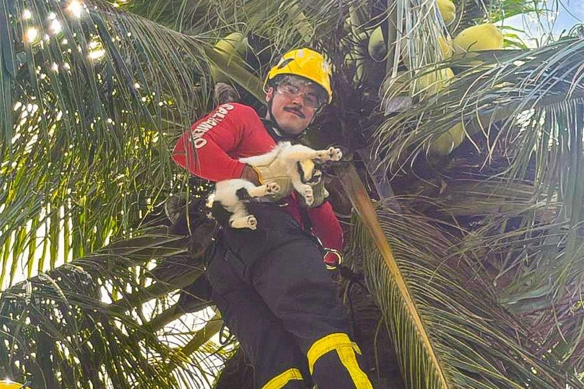 Os militares constataram que se tratava de uma gata doméstica que havia subido até o topo de um coqueiro, impossibilitada de descer por conta própria. A partir dessa avaliação, a guarnição da Auto Bomba Salvamento ABS-05 iniciou o procedimento de resgate, seguindo rigorosamente os protocolos de segurança: posicionamento da escada, fixação e amarrações adequadas, e acesso controlado até o ponto onde o animal se encontrava.