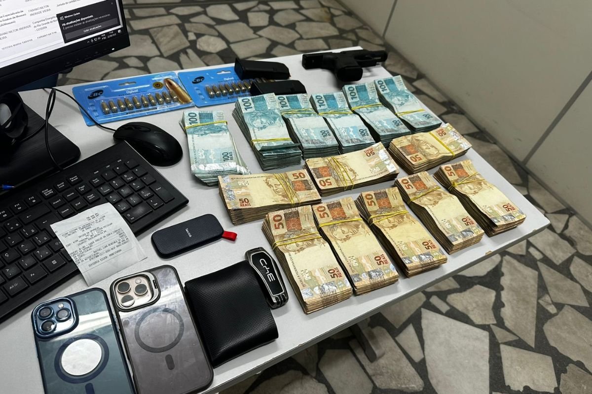 Durante a prisão, os policiais apreenderam R$ 100 mil em espécie, uma arma de calibre restrito e diversas munições. A Justiça autorizou o cumprimento de mandados de busca e apreensão em cinco endereços ligados ao suspeito.
