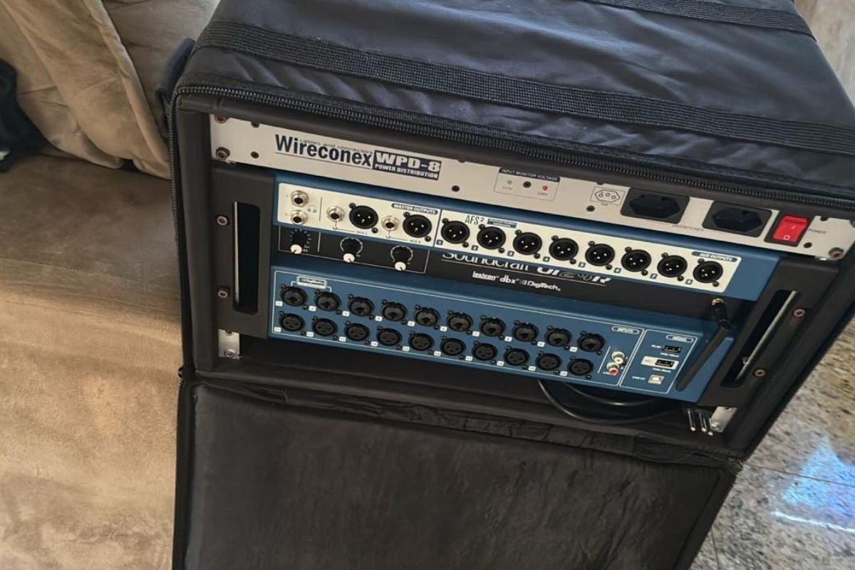 Entre os itens levados durante o crime estão: iPhone 13 Pro Max verde, MacBook Air 2025, pedaleira Roland GT-100, mesa de som Soundcraft Ui24, Apple Watch série 6 Nike, três microfones sem fio Shure, quatro microfones sem fio Dylan, dois transmissores Dylan, uma placa de áudio Gasto Track, um violão preto slim Godin e uma maleta com oito transmissores sem fio do tipo bodypack.