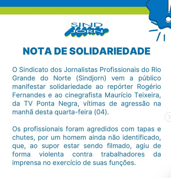 O Sindicato dos Jornalistas Profissionais do Rio Grande do Norte (Sindjorn) divulgou, nesta quarta-feira (4), uma nota de solidariedade ao repórter Rogério Fernandes e ao cinegrafista Maurício Teixeira, da TV Ponta Negra, vítimas de agressão enquanto exerciam atividade profissional em Natal.