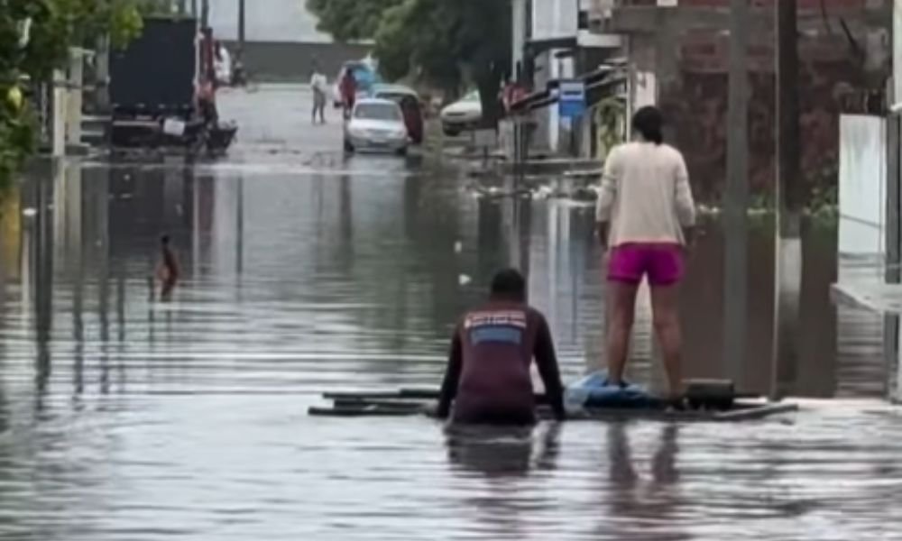 Com o avanço da água, ruas do bairro ficaram parcialmente submersas. Por isso, muitos moradores não conseguem sair de casa sem ajuda ou improvisam balsas para fugir da enchente. A água invadiu ruas e residências, o que aumenta a preocupação na comunidade.
