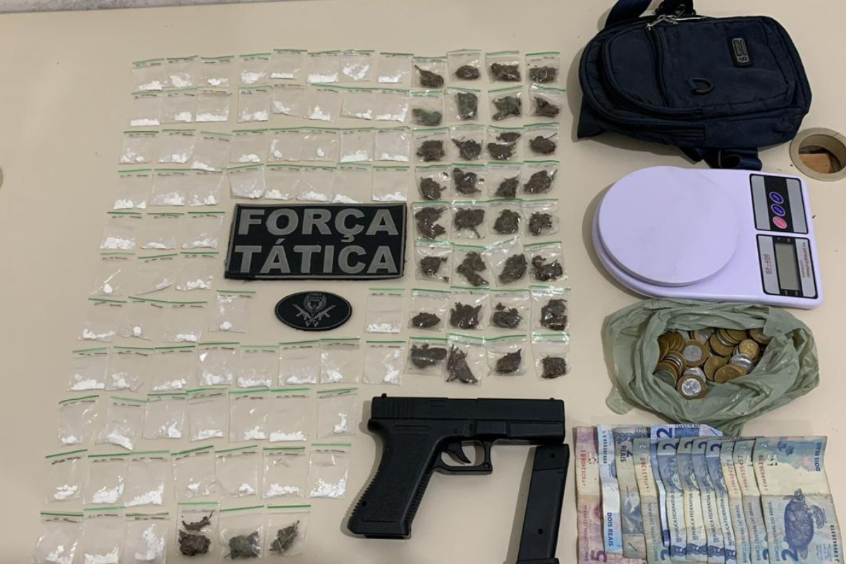Durante a revista, os agentes encontraram 68 porções de substância branca semelhante à cocaína e 35 porções de substância esverdeada semelhante à maconha. Além disso, a equipe apreendeu uma balança de precisão, um simulador de pistola e R$ 54,40 em dinheiro fracionado. Conforme a Polícia Militar, o material reforça a suspeita de comercialização ilícita.