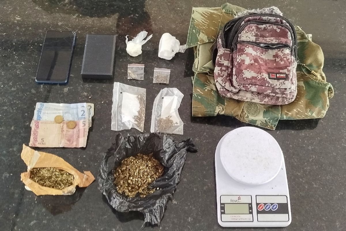 Além das drogas, a equipe recolheu R$ 31,20 em dinheiro fracionado, duas balanças de precisão, um aparelho celular da marca Samsung, de cor azul, e uma bolsa tiracolo. Conforme a Polícia Militar, o conjunto de materiais caracteriza indícios de comercialização de entorpecentes.